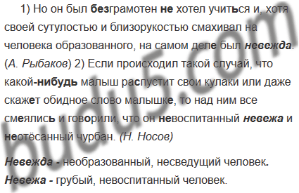 1) Но он был (без)грамотен (не)хотел учит(?)ся и, хотя своей сутулостью и близорукостью смахивал на человека образованного, на самом дел., был (невежа, невежда). (А. Рыбаков) 2) Если происходил такой случай, что какой(нибудь) малыш ра..пустит свои кулаки или даже скаж..т обидное слово малышк.., то над ним все см..ялис(?) и гов..рили, что он (не)воспитанный (невежа, невежда) и (не)отёсанный чурбан. (Н. Носов)