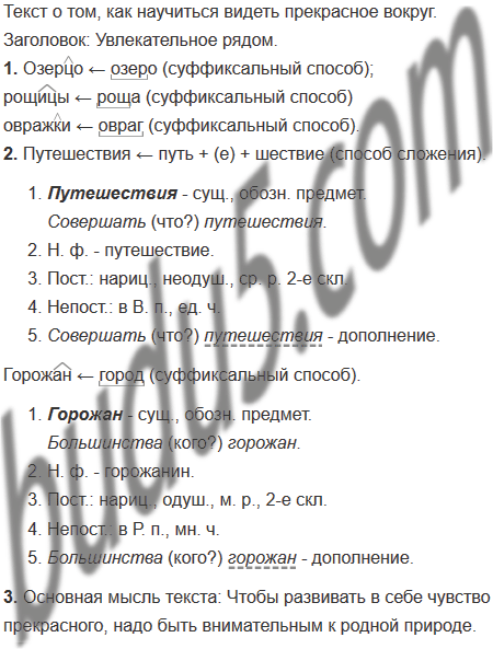 Как ещё в школьные годы научиться видеть и слышать мир, как научиться развивать в себе бережное чувство прекрасного? Обязательно ли для этого совершать, к примеру, дальние путешествия? Нет, не обязательно. Сначала следует научиться смотреть вокруг себя, выработать умение видеть в малом, повседневном большое, необыкновенное. Без этого, я думаю, никакие, даже самые экзотические путешествия не принесут вам полной и глубокой радости познания, а будет лишь удовлетворено простое бесплодное сорочье любопытство. Какое-нибудь неприметное озерцо тут же, за городом, полно жизни, но какова эта жизнь — для большинства горожан, такая же загадка, как тайна планеты Марс. Вот они, дальние неведомые страны, — вокруг тебя! Поля, луга, рощицы, овражки... Вооружайся терпением, вниманием к родной природе и выходи читать увлекательную книгу её жизни. (По Е. Носову)
