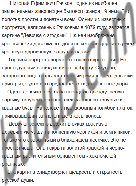 Расскажите (в письменной форме) о картине Н. Рачкова «Девочка с ягодами». Включите в свой рассказ описание костюма девочки.