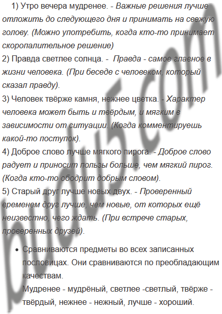 1) Утро вечера мудренее. 2) Правда светлее солнца. 3) Человек твёрже камня, нежнее цветка. 4) Доброе слово лучше мягкого пирога. 5) Старый друг лучше новых двух.