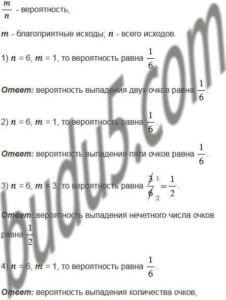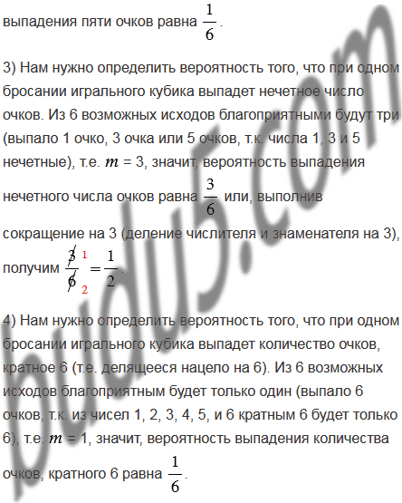 Какова вероятность того, что при одном бросании игрального кубика выпадет количество очков, равное: 1) двум; 2) пяти; 3) нечетному числу; 4) числу, которое кратно 6?