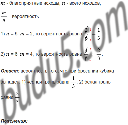 Две грани кубика покрасили в черный цвет, а остальные - в белый. Какова вероятность того, что при бросании кубика выпадет: 1) черная грань; 2) белая грань?