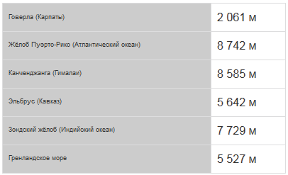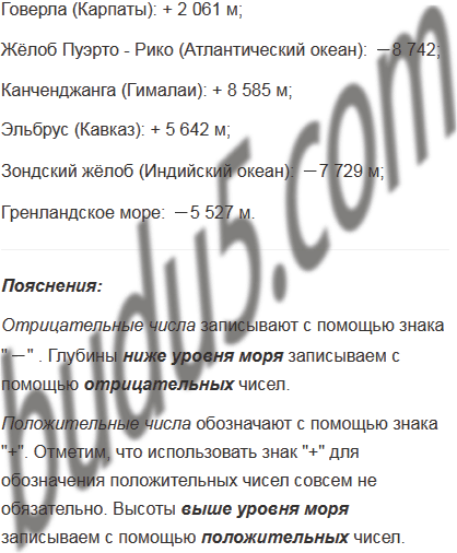 С помощью положительных и отрицательных чисел запишите высоты и глубины, приведённые в таблице.