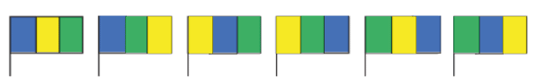 2. Нарисуй в тетради 6 флажков. Раскрась по-разному каждый из флажков тремя цветами - синим, жёлтым и зелёным.