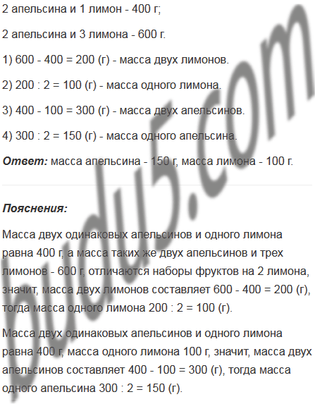 Масса двух одинаковых апельсинов и одного лимона равна 400 г, а масса таких же двух апельсинов и трех лимонов - 600 г. Какова масса одного апельсина и какова - одного лимона?