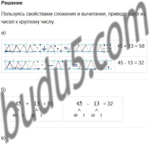 Какой способ тебе больше нравится? Почему? Найди каждым из этих способов значения выражений 45 + 13 и 45 - 13.