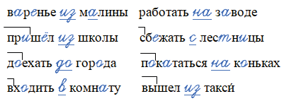 Впишем в словосочетания пропущенные буквы и предлоги. Выделим в словах приставки. Подчеркнём предлоги.