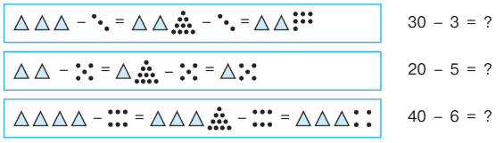 В уменьшаемом нет единиц. Выделяю 10 единиц из 30. 30 - это 20 и 10. Заменяю модель одного треугольника-десятка моделью 10 единиц-точек.