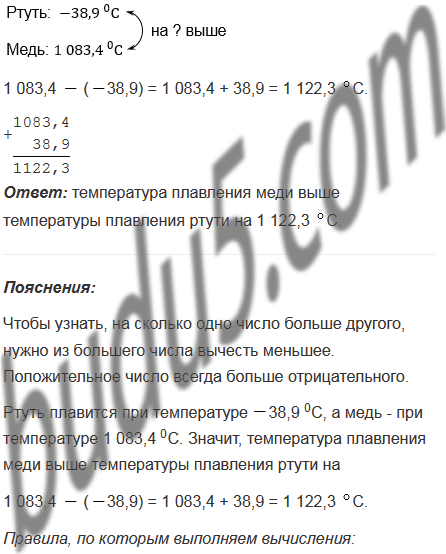 Ртуть плавится при температуре 38,9 0С, а медь - при температуре 1 083,4 0С. На сколько градусов температура плавления меди выше температуры плавления ртути?