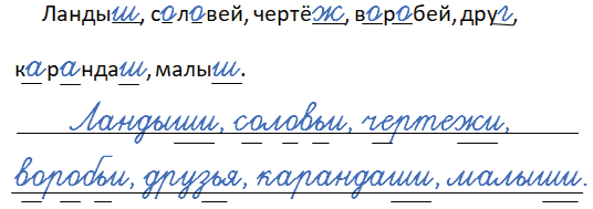 Ландыши, соловьи, чертежи, воробьи, друзья, карандаши, малыши.