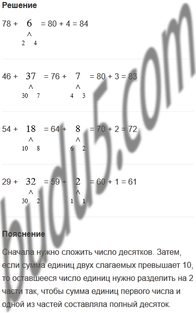 Во втором примере второе слагаемое раскладывают на сумму разрядных слагаемых. К первому слагаемому прибавляют число десятков, а число единиц разбивают на части и затем прибавляют их по отдельности.