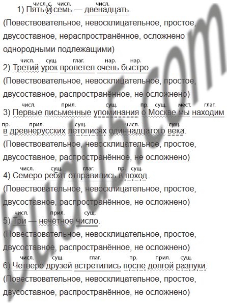 1) Пять и семь — двенадцать. 2) Третий урок пролетел очень быстро. 3) Первые письменные упоминания о Москве мы на ходим в древнерусских летописях одиннадцатого века. 4) Семеро ребят отправились в поход. 5) Три — нечётное число. 6) Четверо друзей встретились после долгой разлуки.
