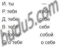 Вспомните и запишите, как склоняется личное местоимение ты. Возвратное местоимение себя имеет те же падежные окончания. Допишите их.