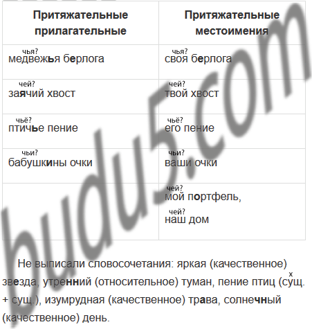Выпишите (по образцу) в один столбик словосочетания, в состав которых входят притяжательные прилагательные, а в другой словосочетания с местоимениями. На что указывают местоимения?