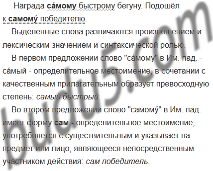 Чем различаются выделенные слова? Награда самому быстрому бегуну. Подошёл к самому победителю. Своё мнение обоснуйте.
