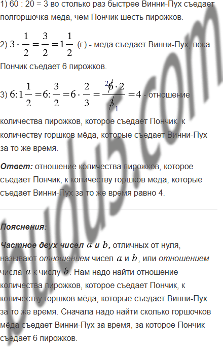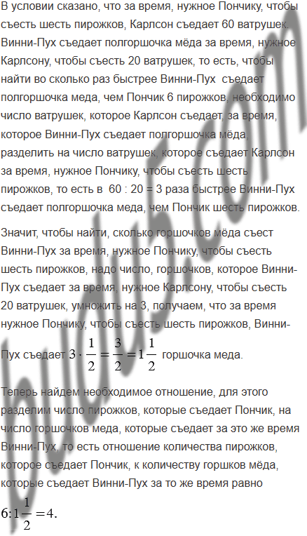 За время, нужное Пончику, чтобы съесть шесть пирожков, Карлсон съедает 60 ватрушек. Винни-Пух съедает полгоршочка мёда за время, нужное Карлсону, чтобы съесть 20 ватрушек. Чему равно отношение количества пирожков, которое съедает Пончик, к количеству горшков мёда, которые съедает Винни-Пух за то же время?