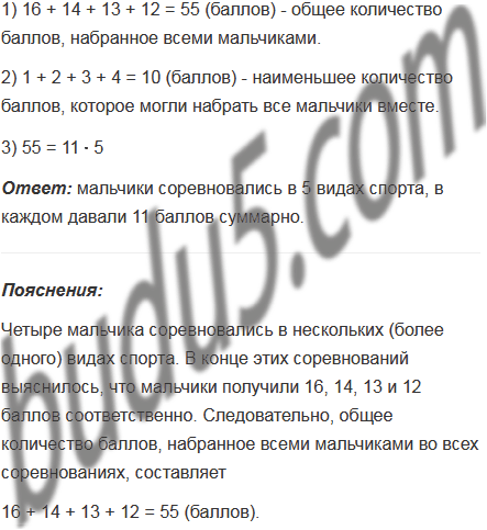 Четыре мальчика соревновались в нескольких (более одного) видах спорта. В каждом из видов спорта за одно и то же место начислялось одинаковое количество баллов (выраженных натуральным числом), причем каждое из мест (1-е, 2-е, 3-е, 4-е) мог занять только один из участников. В конце этих соревнований выяснилось, что мальчики получили 16, 14, 13 и 12 баллов соответственно. Выясните, в скольких видах спорта они соревновались.