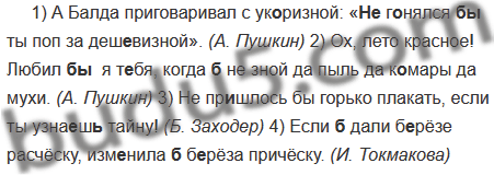 1) А Балда приговаривал с ук..ризной: «(Не)г..нялся(бы) ты поп за деш..визной». (А. Пушкин) 2) Ох, лето красное! Лю-бил(бы) я т..бя, когда(б) не зной да пыль да к..мары да мухи. (А. Пушкин) 3) Не пр..шлось(бы) горько плакать, если ты узна..ш(?) тайну! (Б. Заходер) 4) Если(б) дали б..рёзе расчёску, изм..нила(б) б..рёза причёску. (И. Токмакова)