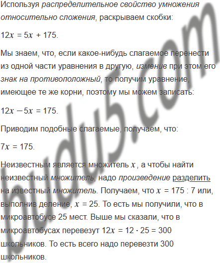 Для перевозки школьников в спортивный лагерь надо заказать 12 микроавтобусов или 5 больших автобусов. Сколько школьников нужно было перевезти, если в большом автобусе на 35 мест больше, чем в микроавтобусе?