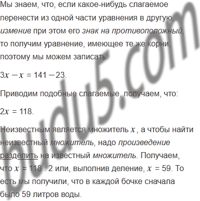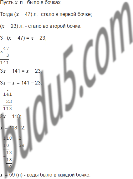 В две бочки для полива огорода налили одинаковое количество воды. Когда из первой бочки использовали 47 л воды, а из второй - 23 л, то в первой осталось в 3 раза меньше воды, чем во второй. Сколько литров воды было в каждой бочке вначале?