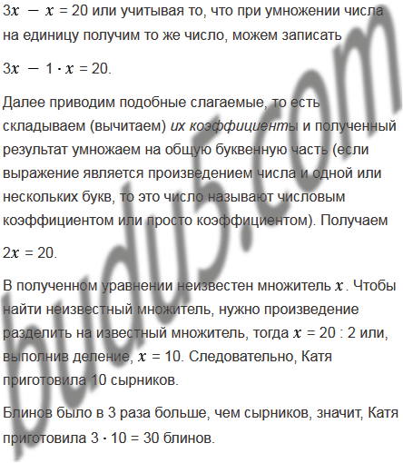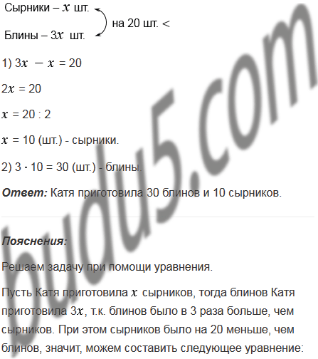 Катя приготовила блины и сырники, причем блинов было в 3 раза больше, чем сырников. Сколько блинов и сколько сырников она приготовила, если сырников было на 20 меньше, чем блинов?