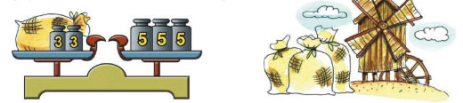 Сначала узнаем, сколько килограммов на одной чаше, а потом вычтем массу гирь с другой чаши и останется масса мешка, так как чаши в равновесии.