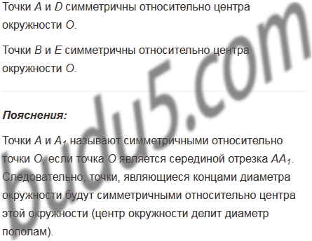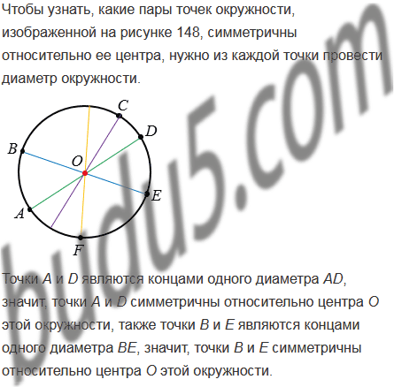 Какие из отмеченных точек окружности (рис. 148) образуют пары точек симметричных относительно ее центра О.