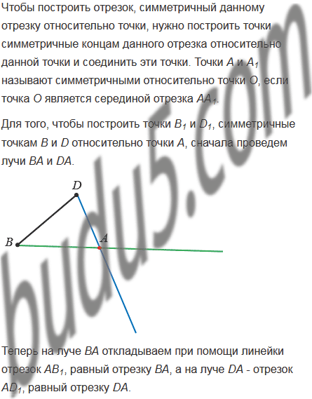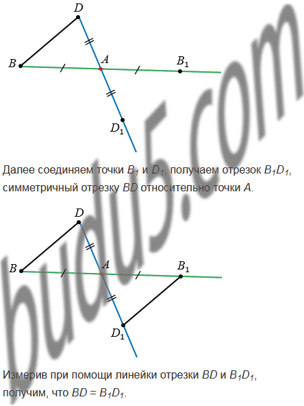 Начертите отрезок ВD и отметьте точку А вне этого отрезка. Постройте отрезок, симметричный отрезку ВD относительно точки А. Сравните полученный отрезок и отрезок ВD.