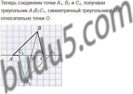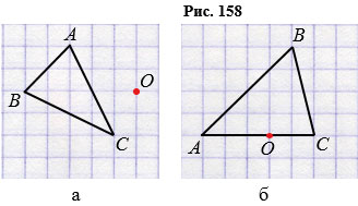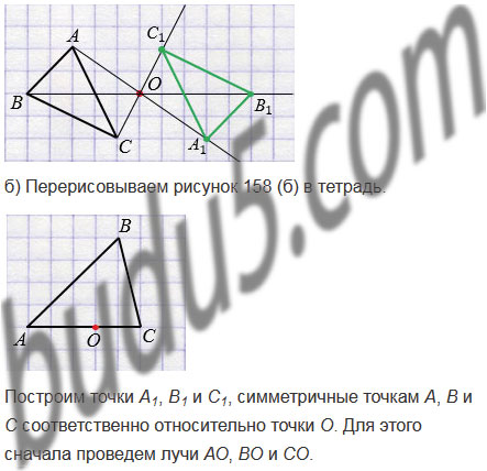 Перерисуйте рисунок 158 в тетрадь и постройте фигуру, симметричную треугольнику АВС относительно точки О.