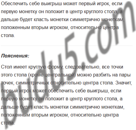 Два мальчика по очереди кладут одинаковые монетки на круглый стол так, чтобы они не накладывались друг на друга. Проигрывает тот, кто не может сделать ход. Кто из двух игроков может обеспечить себе выигрыш и как это сделать?