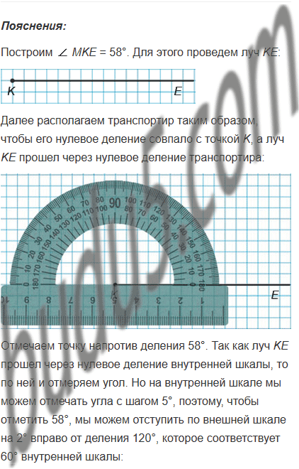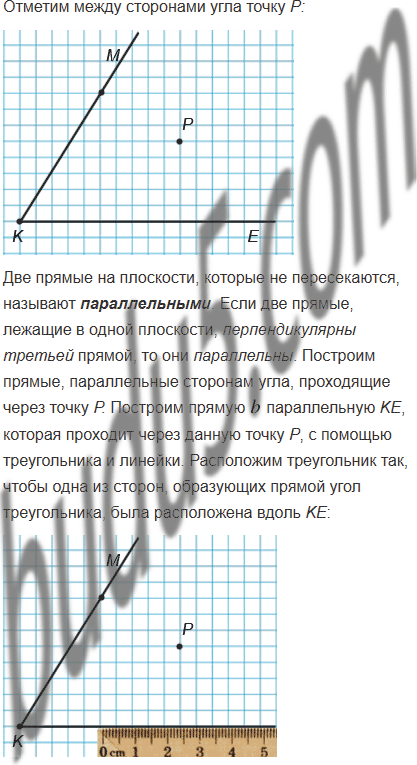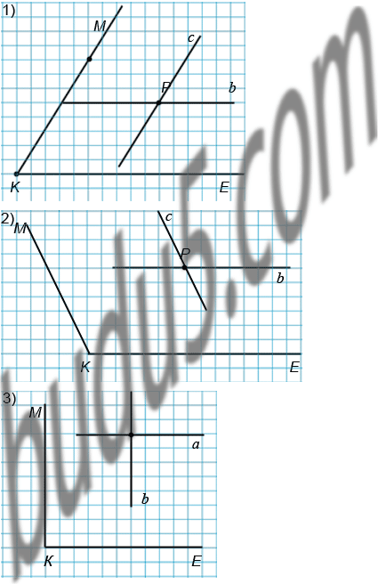 Начертите угол MKE, градусная мера которого равна: 1) 58°; 2) 116°; 3) 90°. Отметьте между сторонами угла точку P и проведите через эту точку прямые, параллельные сторонам угла.