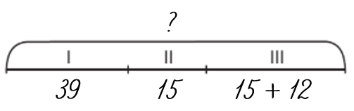 "В первом букете было 39 цветков, во втором - 15 цветков, а в третьем - на 12 цветков больше, чем во втором. Сколько всего цветков в этих трёх букетах?"