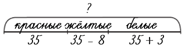 а) Мама посадила в саду 35 красных тюльпанов, жёлтых - на 8 тюльпанов меньше, чем красных, а белых - на 3 больше, чем красных. Сколько всего тюльпанов посадила мама?