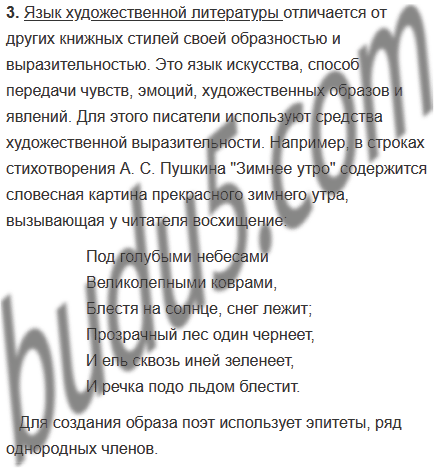 *3. Язык художественной литературы многие учёные относят к книжной речи. И всё же, по их мнению, художественная речь противопоставлена как другим книжным стилям, так и разговорной речи. Расскажите об особенностях художественной речи, которые отличают её от других функциональных разновидностей языка. Приведите примеры.