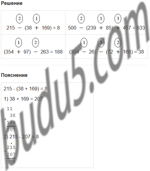 | 215 - (38 + 169) | 500 - (239 + 85) + 457 |