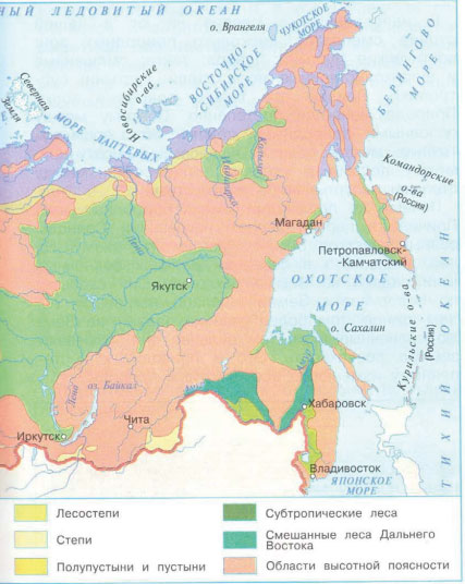 По условным обозначениям природных зон в легенде карты мы видим, что в России существуют следующие природные зоны: арктические пустыни, тундра, лесотундра, тайга, смешанные леса, широколиственные леса, лесостепи, степи, полупустыни и пустыни, субтропические леса, смешанные леса Дальнего Востока, области высотной поясности.