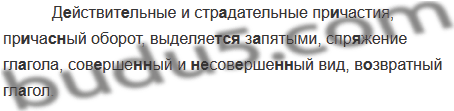 Д..йствит..льные и стр..дательные пр..частия, пр..час(?)ный оборот, выделяет (?)ся з..пятыми, спр..жение гл..гола, сов..рше(н,нн)ый и (не)сов..рше(н, нн)ый вид, в..звратный гл..гол.