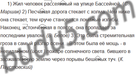 1) Жил человек рассея..ый на улице Бассейной. (С. Маршак) 2) Песча..ая дорога стекает с холма. Чем ниже она стекает, тем круче становятся лома..ые изгибы. Наконец, истончё..ая в поясок, она пропадает за последним увалом. (В. Белов) 3) Это была стремительная гроза в самый разгар осени... В этом была её мощь - в невида..ом пожаре солнечного света. бившего в заржавле..ую землю через порывы беше..ых туч. (К. Паустовский)