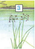 Осока. У осоки стебли трёхгранные с узкими длинными листьями.