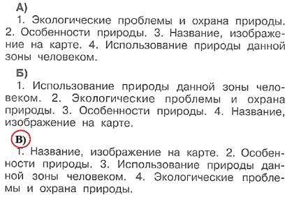В) 1. Название, изображение на карте. 2. Особенности природы. 3. Использование природы данной зоны человеком. 4. Экологические проблемы и охрана природы.
