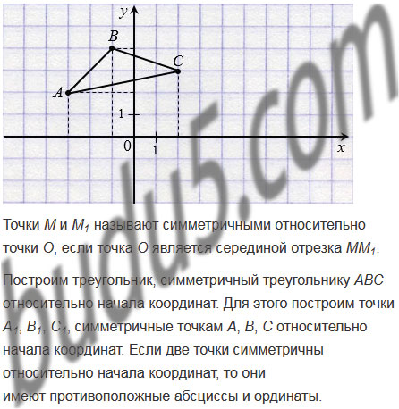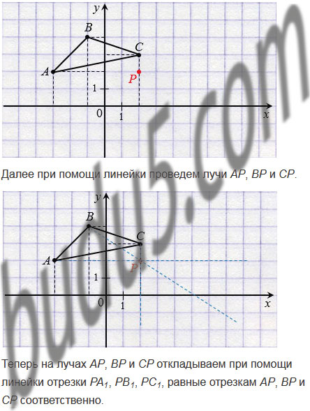 1; 4), С(2;3). Постройте треугольник, симметричный данному относительно: 1) начала координат; 2) точки Р(2; 2). Найдите координаты вершин полученного треугольника.