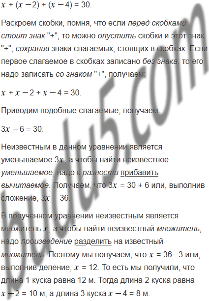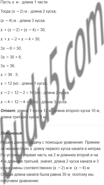 Канат длиной 30 м разрезали на три части. Первая часть на 2 м длиннее второй и на 4 м длиннее третьей. Найдите длину каждой части каната.