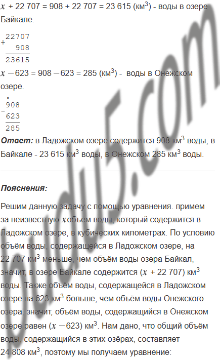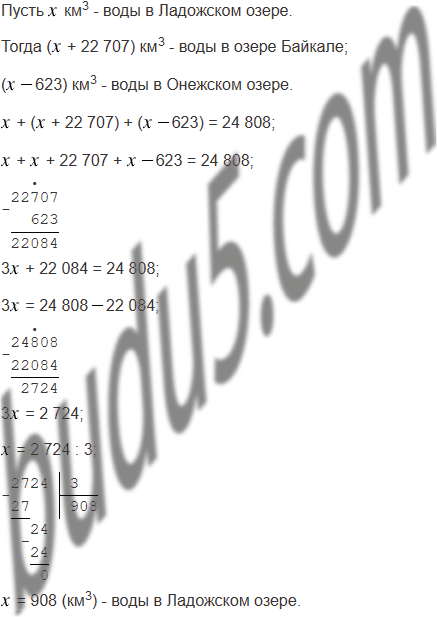 Тремя крупнейшими озёрами России являются озеро Байкал, Ладожское озеро и Онежское озеро. Общий объём воды, содержащийся в этих озёрах, составляет 24 808 км3, причём объём воды, содержащейся в Ладожском озере, на 22 707 км3 меньше, чем объём воды озера Байкал, и на 623 км3 больше, чем объём воды Онежского озера. Сколько кубических километров воды содержится в каждом из этих озёр?