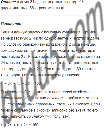 В доме 160 квартир трёх видов: однокомнатные, двухкомнатные и трёхкомнатные. Однокомнатных квартир в 2 раза меньше, чем двухкомнатных, и на 24 меньше, чем трёхкомнатных. Сколько в дома квартир каждого вида?