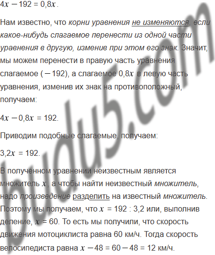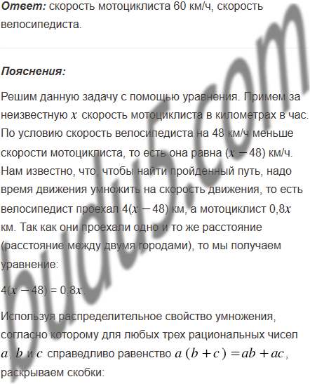 Расстояние между двумя городами мотоциклист проехал за 0,8 ч, а велосипедист - за 4 ч. Скорость велосипедиста на 48 км/ч меньше скорости мотоциклиста. Найдите скорость каждого из них.