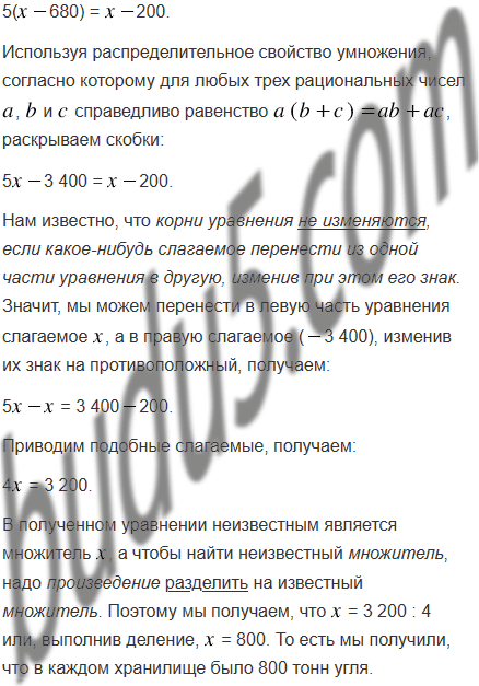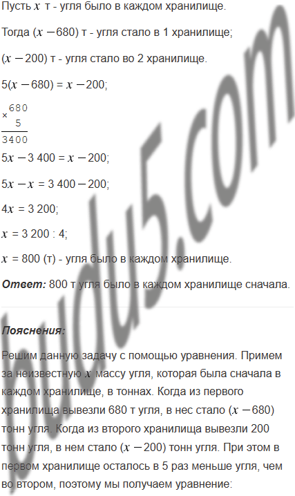 В двух хранилищах было одинаковое количество угля. Когда из первого хранилища вывезли 680 т угля, а из второго - 200 т, то в первом осталось в 5 раз меньше угля, чем во втором. Сколько угля было в каждом хранилище сначала?