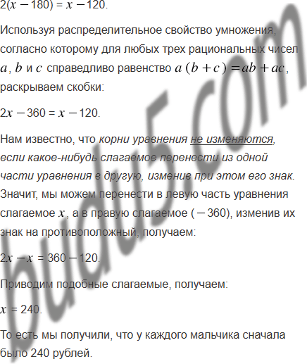У Пети и Васи было поровну денег. Когда на покупку книг Петя потратил 120 р., а Вася - 180 р., то у Пети осталось в 2 раза больше денег, чем у Васи. Сколько денег было у каждого мальчика сначала?
