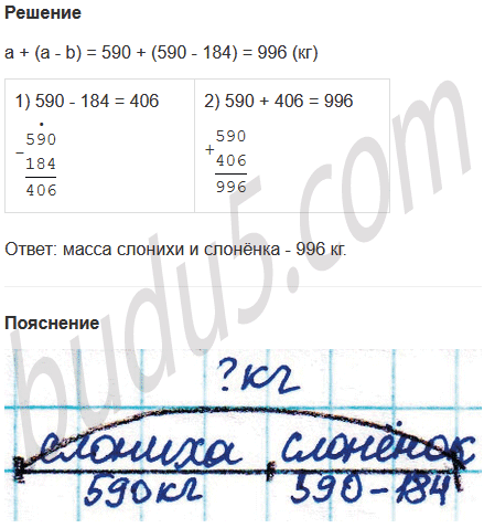 Задание № 11. Составь выражение и найди его значение при а = 590, b = 184: "Масса слонихи а кг, а слонёнка - на b кг меньше. Чему равна масса слонихи со слонёнком?
