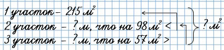8. Площадь первого участка земли 215 м2. Это на 98 м2 меньше площади второго участка и на 57 м2 больше площади третьего. Чему равна площадь этих трёх участков?