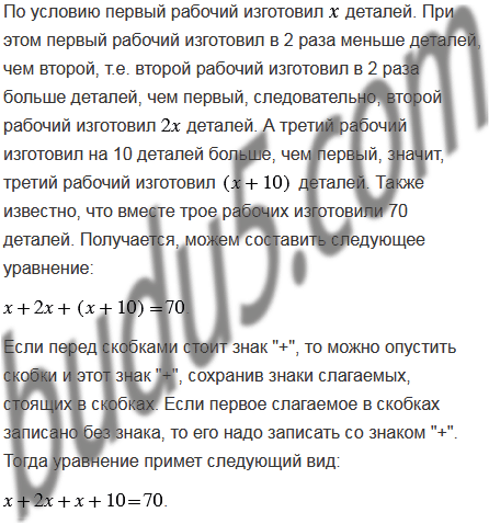 Трое рабочих изготовили 70 деталей. Первый рабочий изготовил в 2 раза меньше деталей, чем второй, а третий на 10 деталей больше, чем первый.